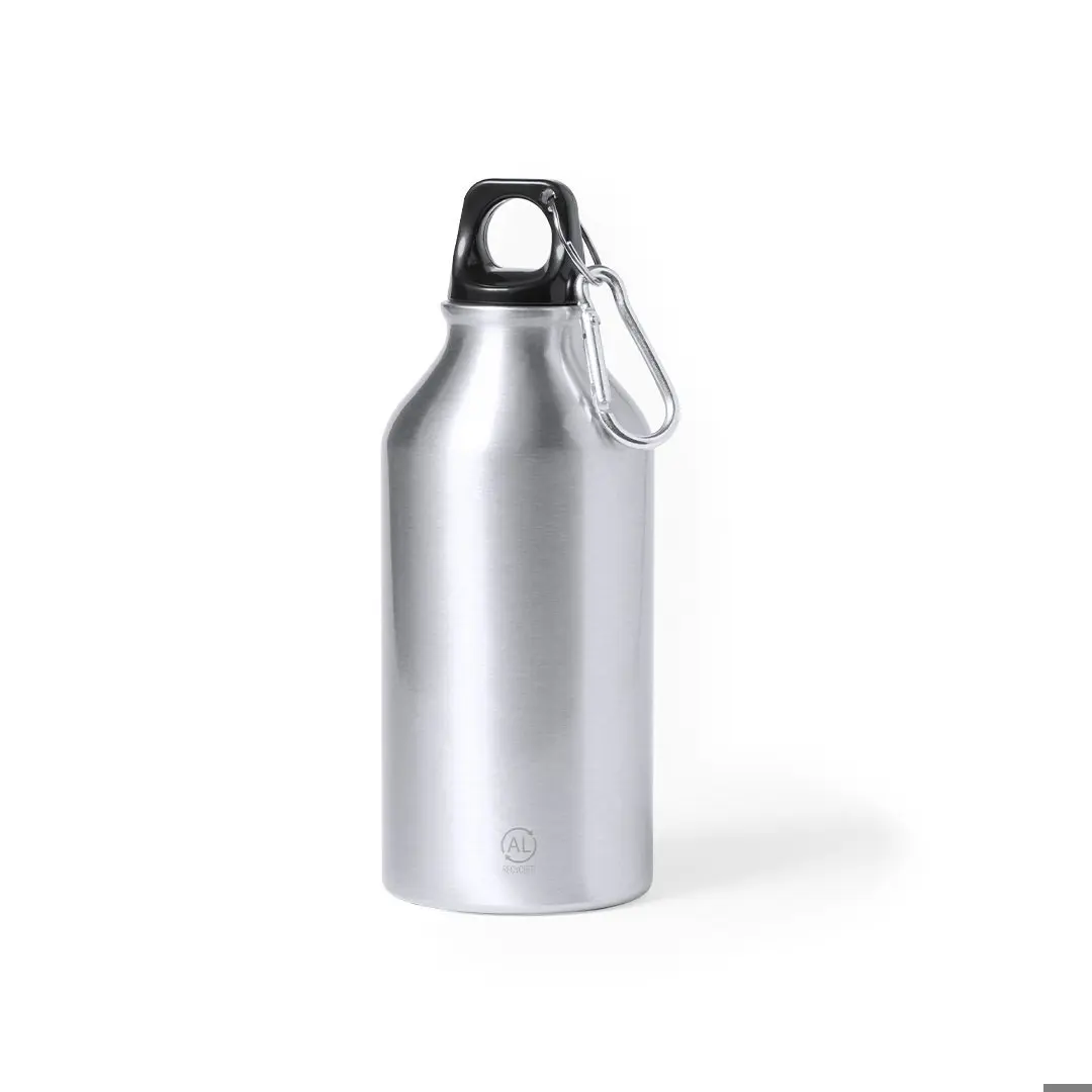 Bidón de 400 ml de capacidad. Fabricado en aluminio reciclado, con posibilidades de reciclaje casi infinitas, sin perder sus propiedades originales y consumiendo menos energía en este proceso. De acabado mate, con tapón a rosca en negro, anilla y mosquetón de transporte. Libre de BPA y presentado en caja individual de diseño kraft.