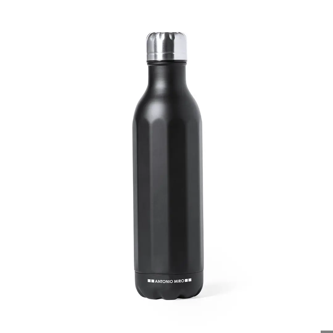 Edelstahltrommel von Antonio Miró. Mit einem Fassungsvermögen von 750 ml und einem nüchternen, satinschwarzen Finish, mit einem Prismenkörper und dem Markenlogo auf der Basis. Mit verchromtem Schraubverschluss und präsentiert in einer attraktiven Designbox mit dem Markenlogo.