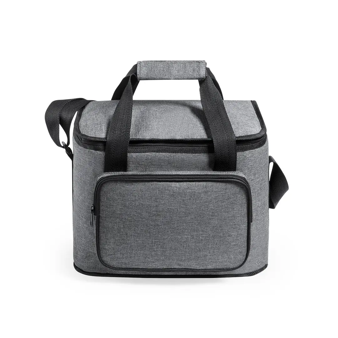 Nature Line Kühltasche in widerstandsfähigem 600D RPET Melange-Effekt, hergestellt aus recyceltem Kunststoff, um die Wiederverwendung von Kunststoffabfällen zu fördern und zur Nachhaltigkeit des Planeten beizutragen. Schwarze Details und verstärkter Sockel. Hauptfach mit Reißverschluss und PEVA-Futter. Inklusive Außentasche mit Reißverschluss, verstärkten Griffen mit Klettverschluss und verstellbarem Schultergurt, mit RPET-Plakette auf dem Außenetikett.