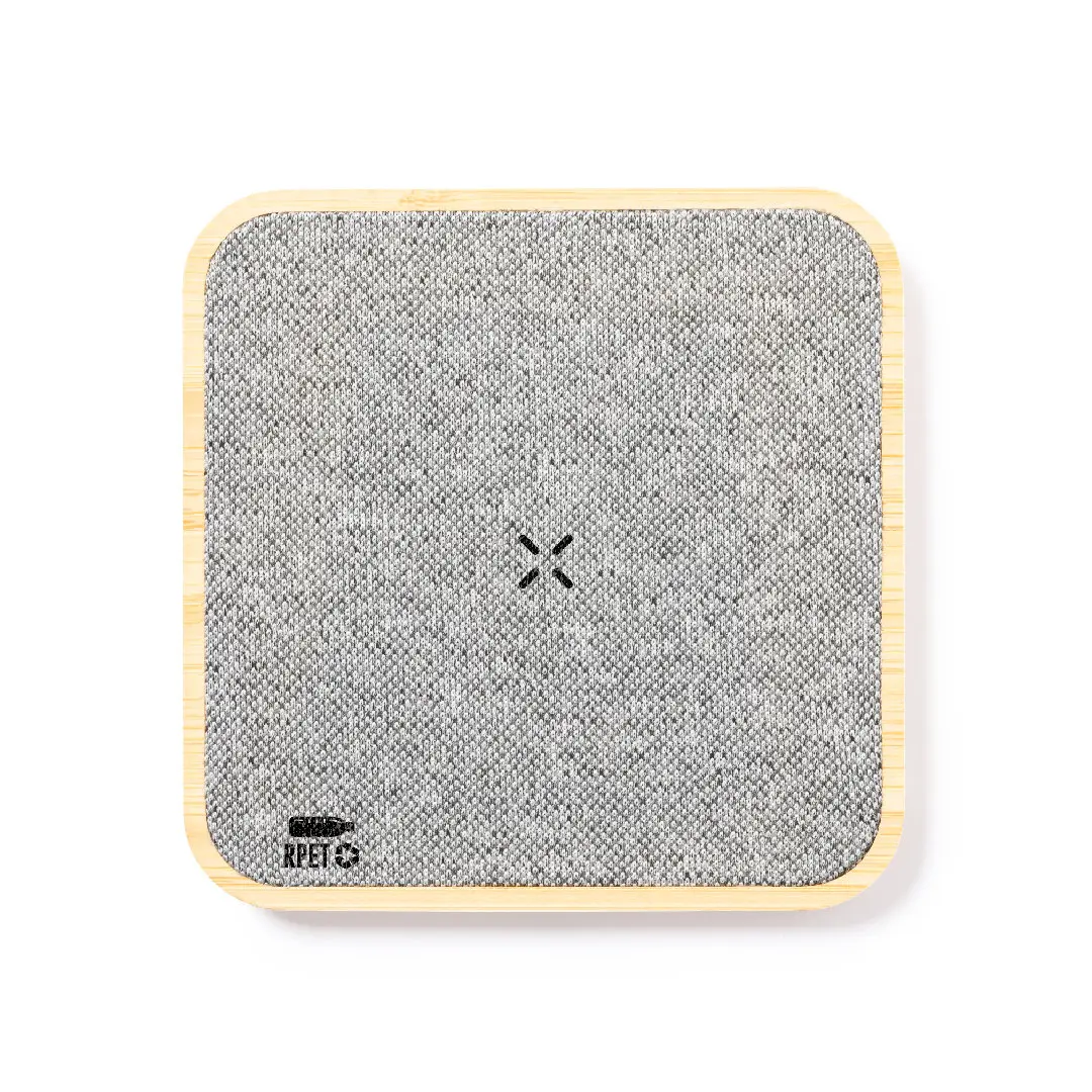 Cargador inalámbrico 15W de diseño rectangular. Fabricado en bambú y poliéster RPET, elaborado a partir de plástico reciclado, para así fomentar la reutilización de residuos plásticos y ayudar a la sostenibilidad del planeta. Compatible con dispositivos equipados con tecnología de carga inalámbrica Qi. Incluye cable cargador Tipo C y manual de instrucciones en español e inglés. Con distintivo RPET y presentado en caja individual de diseño kraft. Fabricado conforme a los estándares RoHS y en cumplimiento con los siguientes requisitos de seguridad: Sistema de protección contra sobrecalentamiento. Sistema de protección contra sobrecarga. Sistema de bloqueo para evitar cortocircuitos.
