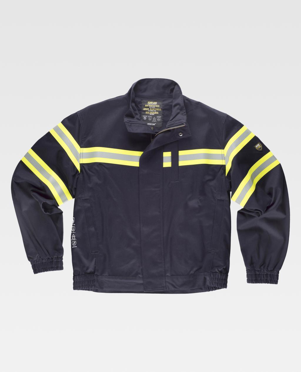 Flammhemmende, antistatische Ummantelung mit Schweiß- und Lichtbogenschutz durch reflektierend-fluoreszierende Bänder. Stehkragen, Metallreißverschluss und Haken- und Ösenverschlüsse, die von einer falschen Klappe verdeckt werden. Eine Brusttasche und zwei Seitentaschen, alle Knopflöcher mit Sicherheitsklappen und verdeckten Schließen. Ein flammhemmendes, reflektierendes und fluoreszierendes Band auf Brust und Rücken und zwei auf den Ärmeln. Elastischer Bund. Gummizug an den Seiten der Taille Flammhemmende, antistatische Ummantelung mit Schweiß- und Lichtbogenschutz durch reflektierend-fluoreszierende Bänder. Stehkragen, Metallreißverschluss und Haken- und Ösenverschlüsse, die von einer falschen Klappe verdeckt werden. Eine Brusttasche und zwei Seitentaschen, alle Knopflöcher mit Sicherheitsklappen und verdeckten Schließen. Ein flammhemmendes, reflektierendes und fluoreszierendes Band auf Brust und Rücken und zwei auf den Ärmeln. Elastischer Bund. Gummizug an den Seiten der Taille.