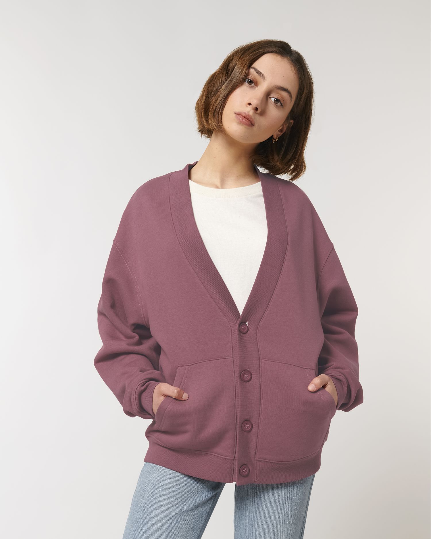 Oversized Unisex-Cardigan. Oversized, V-Ausschnitt, Long Sleeve, Aufgerautes Sweatshirt. Eingesetzte Ärmel (Set in) 1x1-Rippstrick an Halsausschnitt, Knopfleiste, Ärmelenden und am unteren Saum Nackenband aus Single-Jersey Abgesetzter Halbmond im Nacken Knöpfe vorn mittig Einfache Absteppung an Halsausschnitt und Knopfleiste Kängurutasche vorn