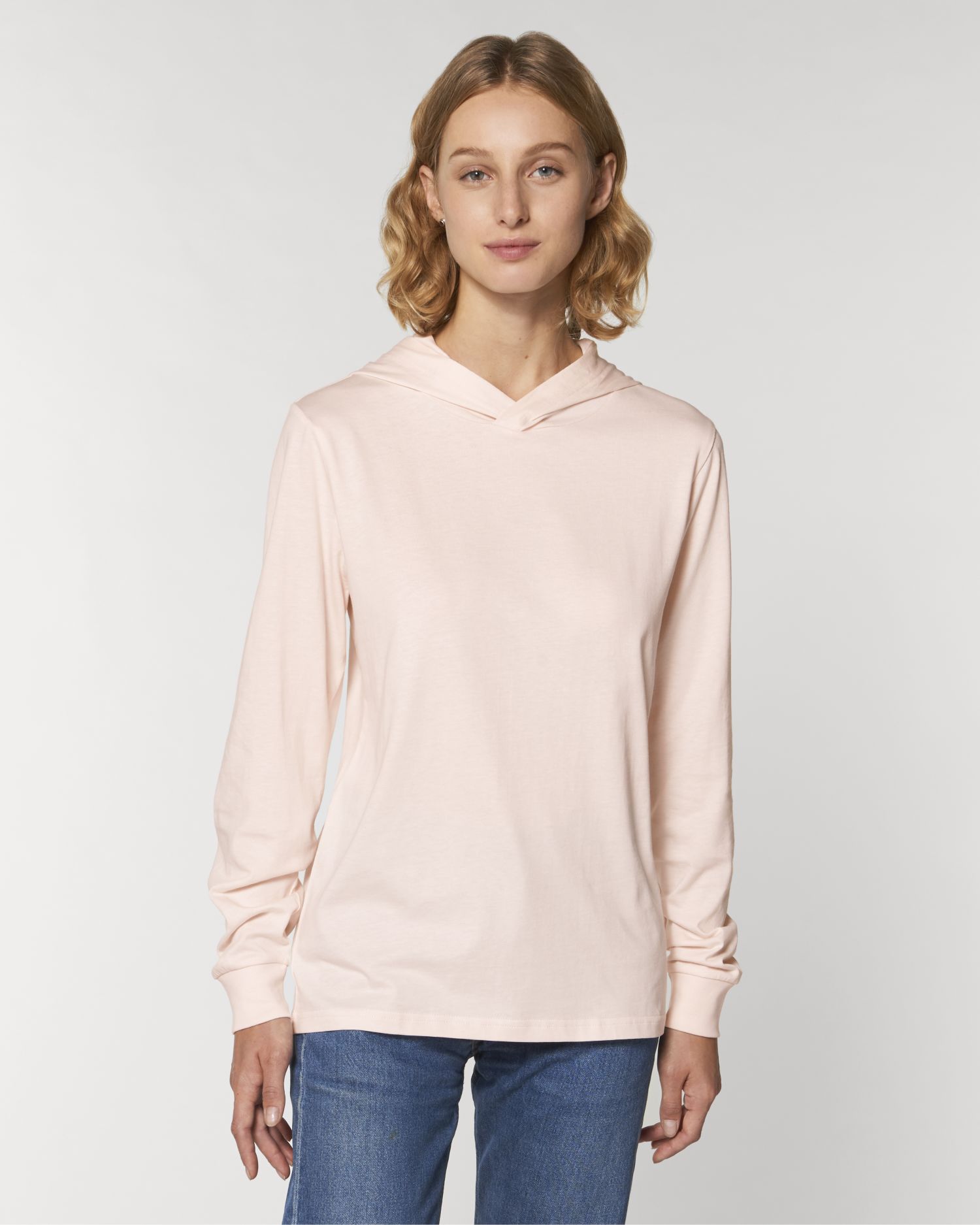 Unisex hoodie T-shirt. Normale Passform, Rundhalsausschnitt mit Kapuze, Long Sleeve, Singlejersey. Eingesetzte Ärmel Kapuze mit abgesetztem Futter Abgesetztes Nackenband 1x1 Rippstrick Einfassung Breite Doppelabsteppung am Saum