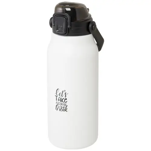 Diese große RCS-zertifizierte Flasche aus recyceltem Edelstahl versorgt Sie stilvoll den ganzen Tag über mit Flüssigkeit. Die Kupfer-Vakuumisolierung hält Getränke mehrere Stunden lang heiß oder kalt, und mit dem klappbaren Griff lässt sie sich leicht transportieren. Die Flasche ist auslaufsicher und lässt sich per Knopfdruck leicht öffnen. Das Fassungsvermögen beträgt 1600 ml. Verpackt in einer Geschenkbox aus Recyclingkarton.