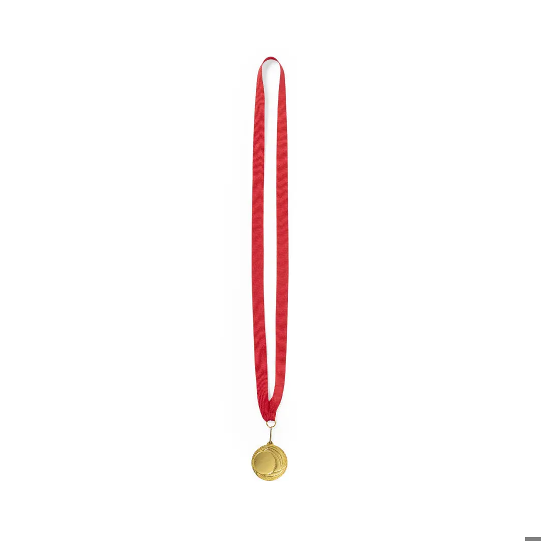 Geprägte Metallmedaille mit Gold-Finish. Mit rotem Polyesterband, passendem Metallkarabiner und speziell für die Laserbeschriftung konzipiert.