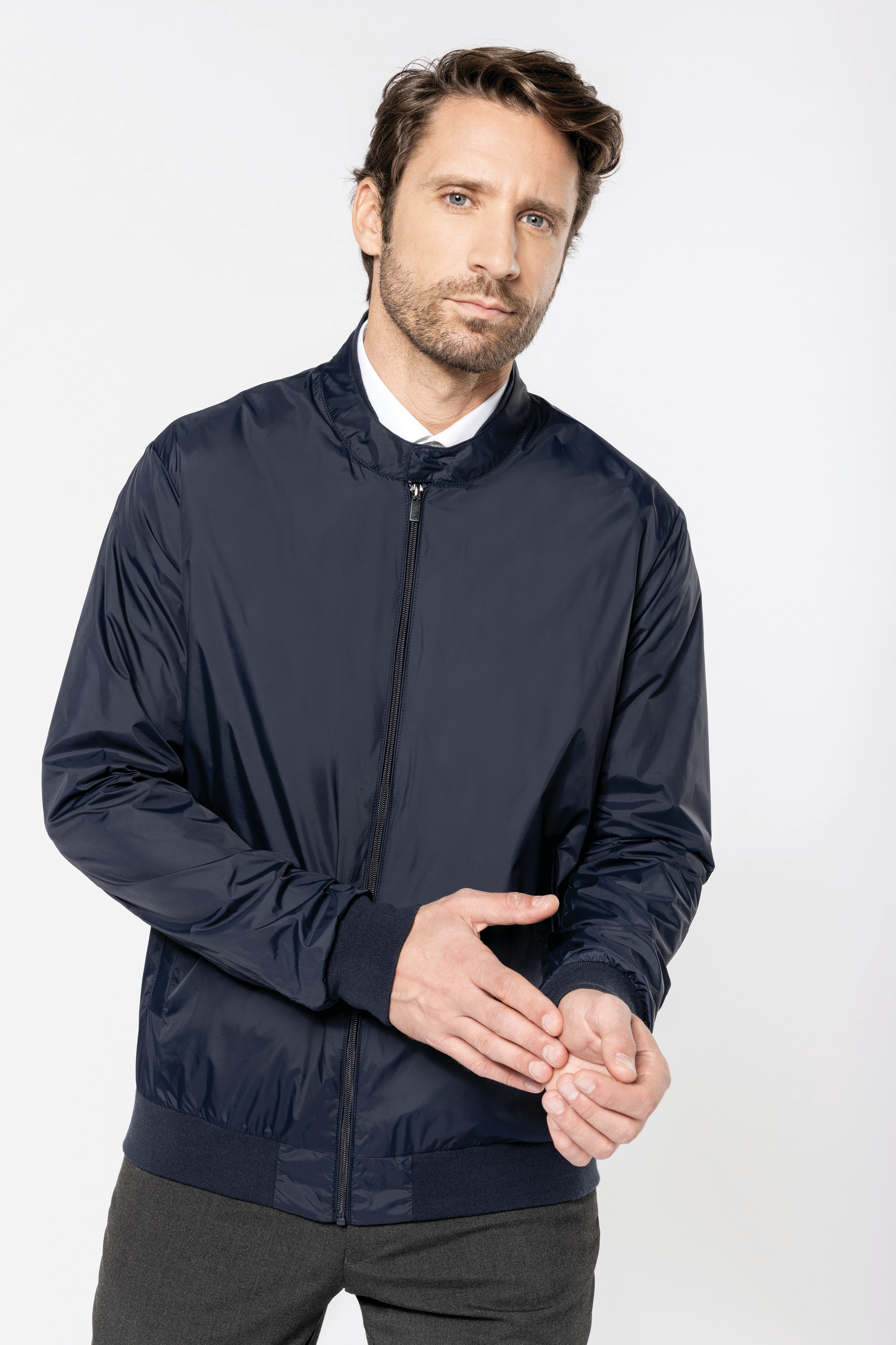 100 % Polyamid. Reißverschluss mit Metall, Druckknöpfe am Ausschnitt. Seitentaschen mit Druckknöpfen. Doppelkrage mit Innenkragen aus 1x1-Rippstrick mit verengten Ärmelbündchen und Saum aus 1x1-Rippstrick (97 % Polyester/3 % Elasthan). Schlaufe auf der Innenseite des Halsausschnitts zum Aufhängen der Jacke. Innennaht an Ärmeln und Ärmelbündcheen für einen raffinierten Abschluss. Leichtes Innenfutter oben am Rücken mit Patch zur einfachen Veredelung. Veredelbarer Reißverschluss innen auf der Herzseite. Kein Markenetikett, nur Größenkennzeichnung für eine leichtere Veredelung. Leichte Herren-Jacke im lässigen City-Look. Der Doppelkragen ist nicht nur stylish, sondern sorgt darüber hinaus auch für mehr Wärme.