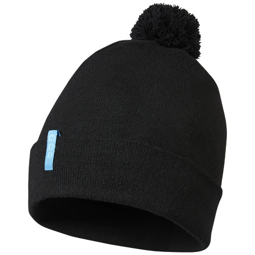 Einlagige, nachhaltige Mütze mit doppelt gefaltetem Rand und passendem Bommel. Schlaufenetikett mit Markenlogo. Hergestellt aus 4 recycelten PET-Flaschen.