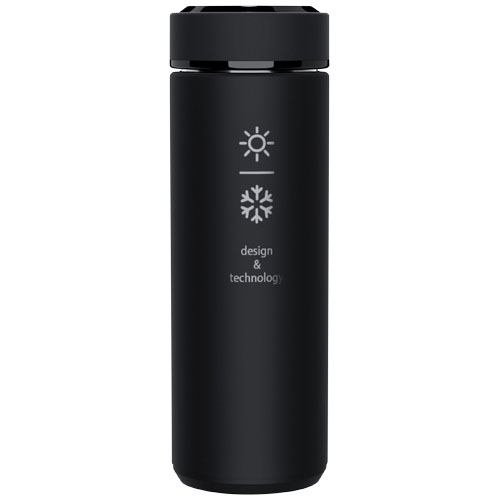 Doppelwandige, isolierte 500 ml Edelstahlflasche mit antibakterieller Oberfläche und einem Temperatursensor. Dank des "Touch & Light"-Systems wird die Temperatur des Getränks auf dem Flaschendeckel angezeigt (in Celsius). Sowohl für heiße als auch für kalte Getränke geeignet. Wird in einer zylindrischen Geschenkbox aus Recyclingpapier geliefert. Größe: Ø 47 x 225 mm. Inklusive Batterie: CR 2450 (3V). Die Batterie kann nicht ausgetauscht werden. Kann die Temperatur 20.000 Mal anzeigen.