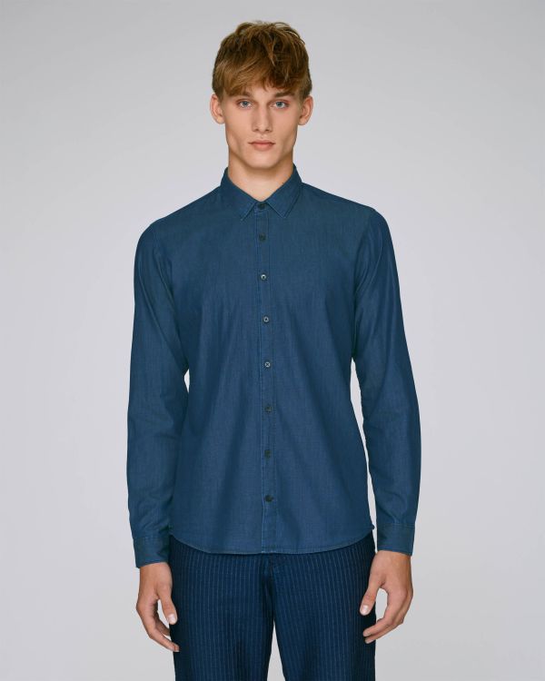 Herren Jeanshemd . Normale Passform, Rundhalsausschnitt, Cuff Sleeve, Gewebt denim. Kragen mit Kragensteg