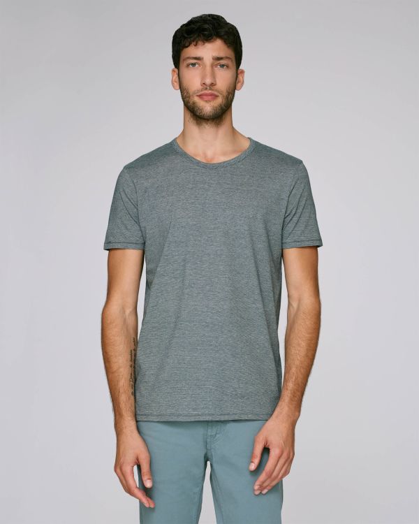 Herren T-Shirt mit Mikrostreifen . Normale Passform, Rundhalsausschnitt, Short Sleeve, Garngefärbter Singlejersey. Eingesetzte Ärmel Abgesetzte Einfassung am Ausschnitt mit Doppelabsteppung Verdeckte Absteppung an Ärmelenden und unterem Saum