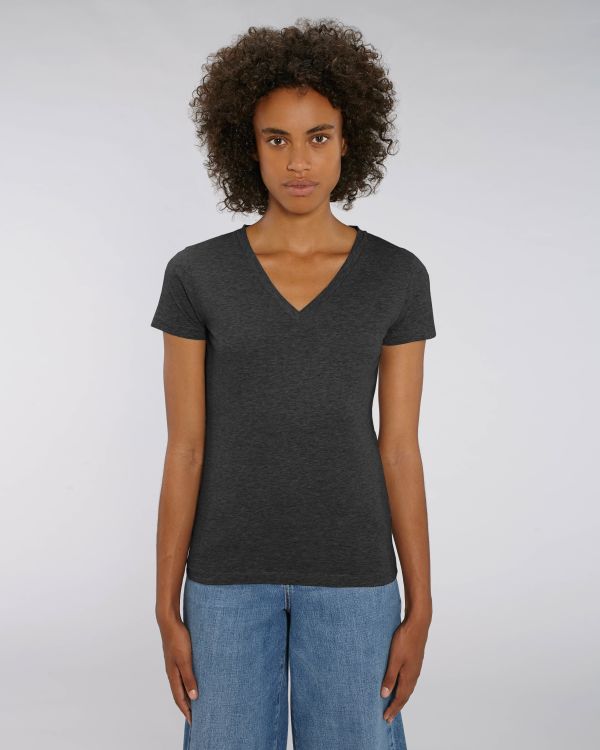 Damen T-Shirt mit V-Ausschnitt. Normale Passform, V-Ausschnitt, Short Sleeve, Singlejersey. Eingesetzte Ärmel