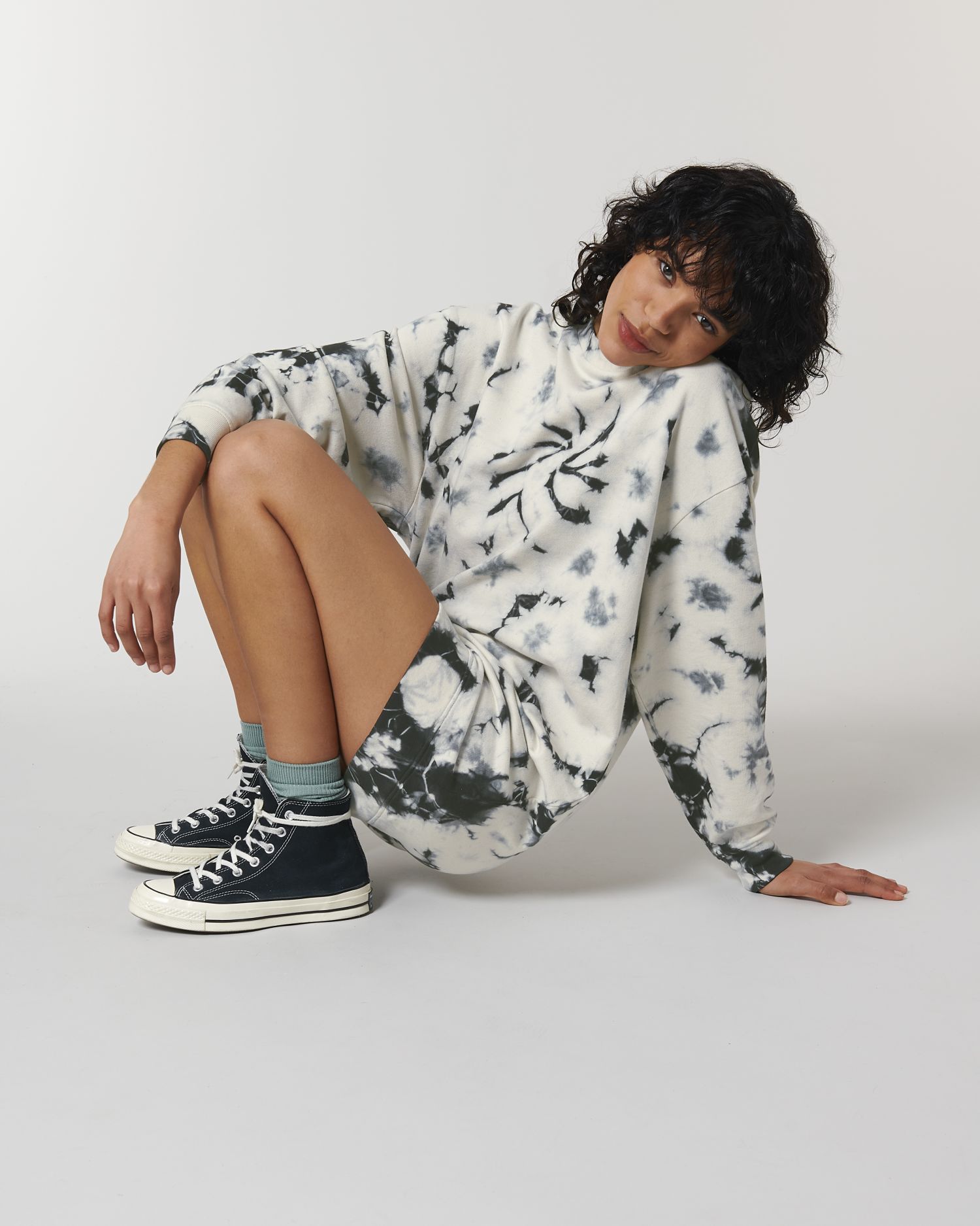Oversized Damen-Batikkleid mit Rundhalsausschnitt. Oversized, Rundhalsausschnitt, Long Sleeve, Terry. Eingesetzte Ärmel (Set in) 1x1-Rippstrick an Halsausschnitt, Ärmelenden und am unteren Saum Nackenband mit Fischgrätmuster Abgesetzter Halbmond im Nacken Einfache Absteppung an Ärmelenden und am unteren Saum Stückgefärbtes Produkt, jeder Artikel kann im Aussehen variieren, Farbe kann abfärben, Pflegehinweise beachten Druckempfehlungen beachten