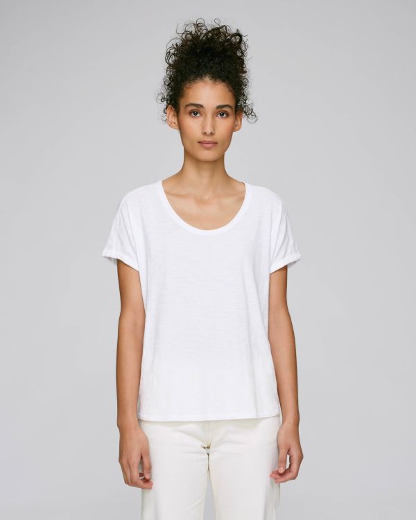 Damen T-Shirt mit weiter Passform . Lässige Passform, Rundhalsausschnitt, Short Sleeve, Slub Single Jersey. Angeschnittene Ärmel