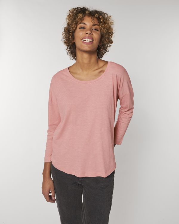 Damen 3/4-Ärmel-T-Shirt mit abgesenkter Schulter. Lässige Passform, Rundhalsausschnitt, 3/4 Sleeve, Slub Single Jersey. Überschnittene Ärmelansätze