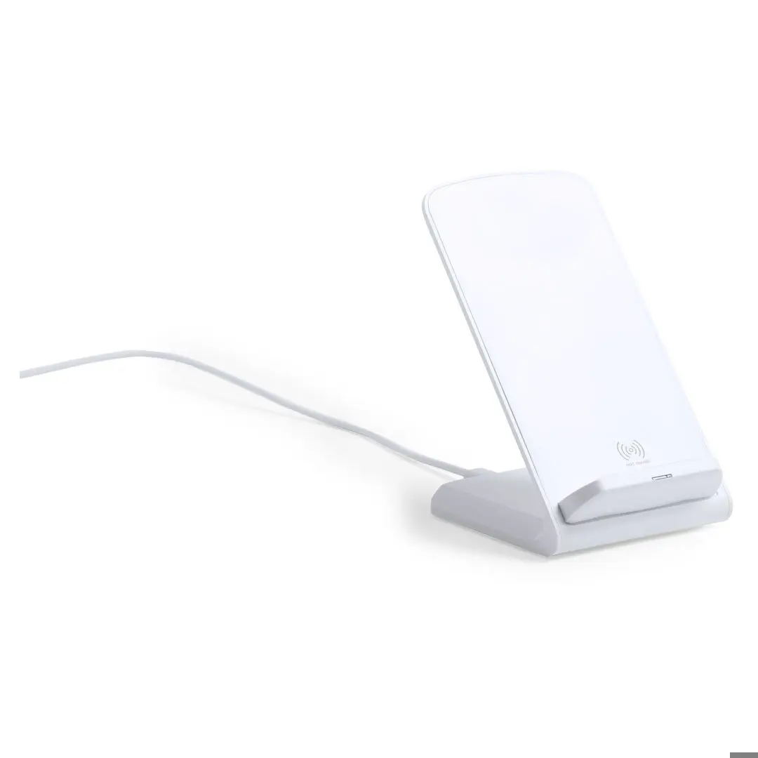 Drahtloses Ladegerät in elegantem Weiß, mit Smartphone-Halterungsfunktionalität. Mit Schnellladung, 10W-Funktion und kompatibel mit Geräten, die mit drahtloser Ladetechnologie ausgestattet sind. Großer Druckbereich und präsentiert in einer attraktiven, individuellen Design-Box.