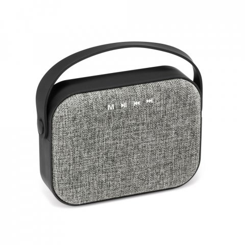 Bluetooth Lautsprecher aus ABS mit Polyestergewebe verkleidet und gummierter Oberfläche. Dieser Lautsprecher hat einen 3.5 mm AUX Anschluss, einen TF Kartenleser, eine Ausgangsleistung von 2 x 3W/4Ω und eine Wiedergabedauer bis zu 4 Stunden. Zu seinen Funktionen gehören: Anrufannahme, Lautstärkeregelung und Verbindung zur Playlist des Mobilgerätes. Inklusive USB Ladekabel. Geliefert in einer Geschenkschachtel.160 x 120 x 50 mm | Schachtel: 180 x 180 x 66 mm