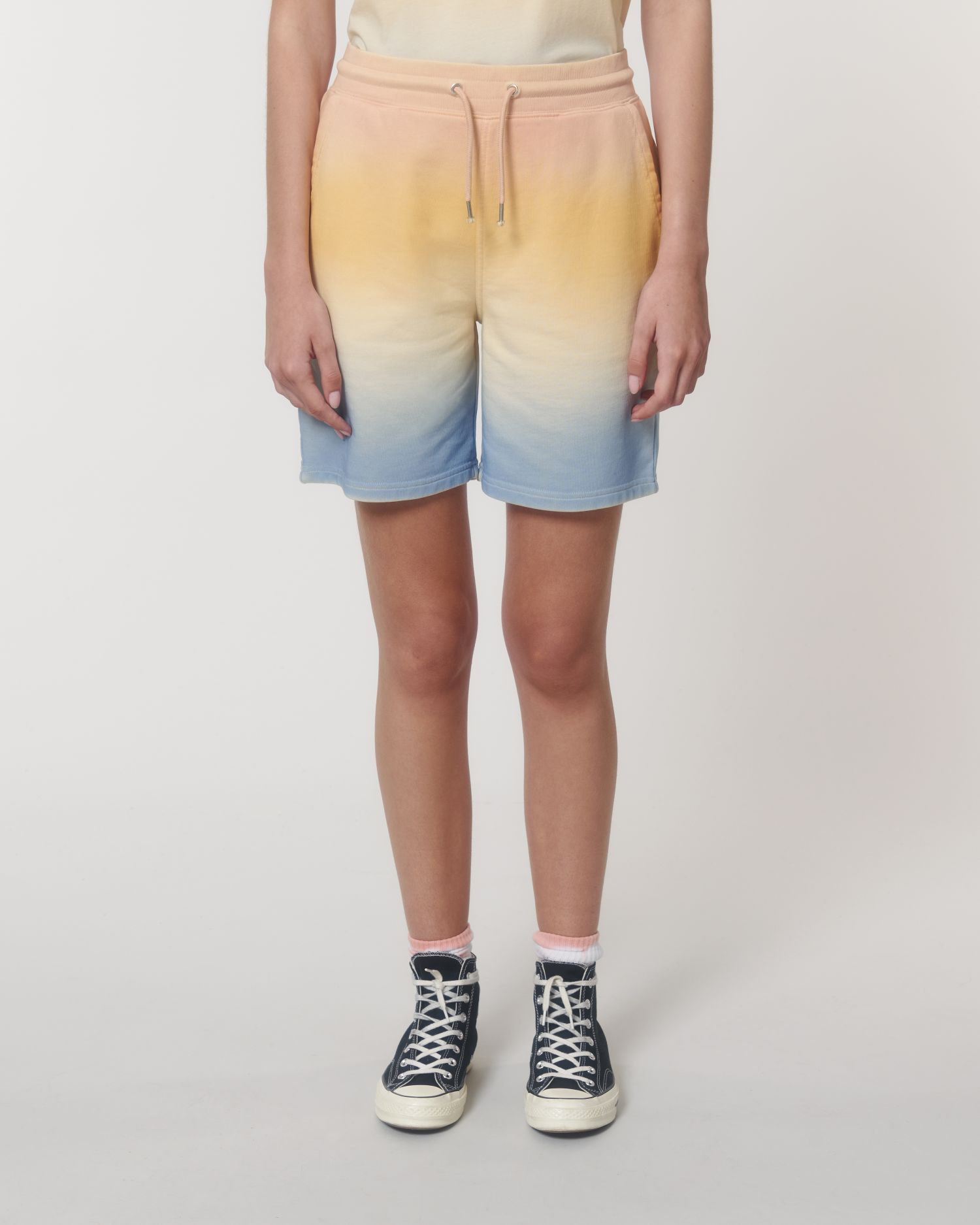 Kurze Unisex-Jogginghose Ombre. Normale Passform, , , Terry. 1x1-Rippstrick am Hosenbund Runde gleichfarbige Kordel, Kordelenden aus Metall Metallösen Taschenfutter aus Single Jersey Aufgesetzte Gesäßtasche Doppelabsteppung an Bund, Taschenöffnung und Schrittnähten Breite Doppelabsteppung am unteren Saum Handgefärbtes Produkt, jeder Artikel kann optisch variieren, Farbe kann abfärben, Pflegehinweise beachten Druckempfehlungen beachten